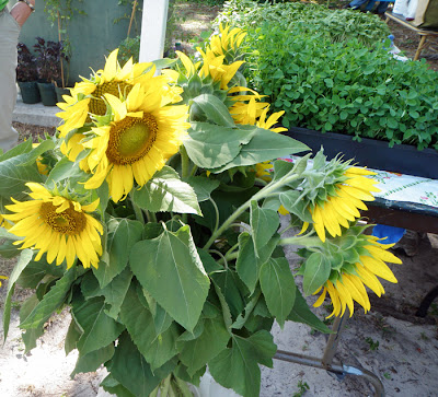 A few weeks ago, Joan found a spinach that is supposed to like hot weather. So we'll put that in somewhere:Yesterday we went to the Farmer's Market to find more herbs. One thing we're looking for is culantro, which is a tropical relative of cilantro that does well in hot weather. The herb/worm poop guy has culantro, but he hasn't had it for the past few weeks.